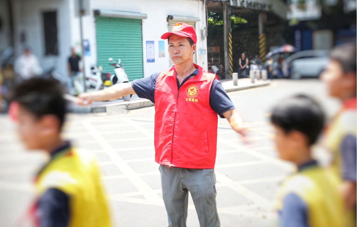 烈日下,個(gè)子不高曬得黝黑的張景錢(qián)早已汗流浹背。近5年來(lái),他打著兩份工,腳下奔波著生活,心中追逐著公益,不僅堅(jiān)守在護(hù)學(xué)崗上,更是帶著志愿者隊(duì)伍參加各類志愿服務(wù)。“我就是想做點(diǎn)力所能及的事,給孩子樹(shù)立榜樣!
