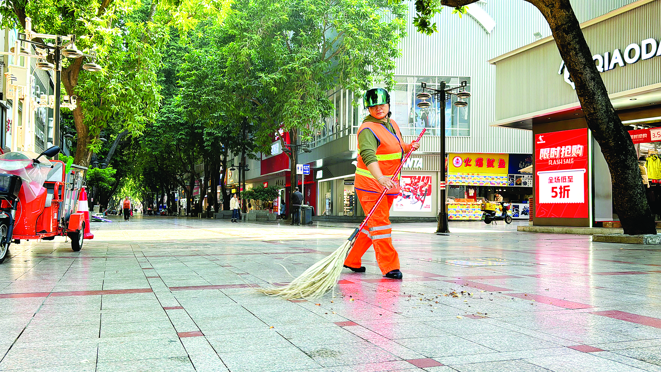 環(huán)衛(wèi)人員 嚴(yán)春秀在步行街清掃垃圾。