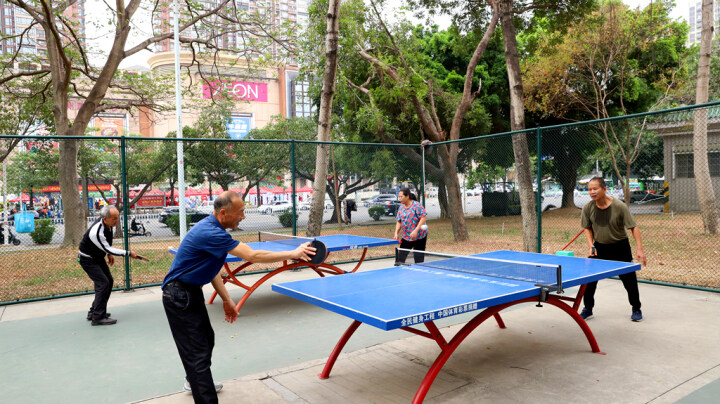 市民享受家門口運動便利,在市區(qū)東平公園打乒乓球。