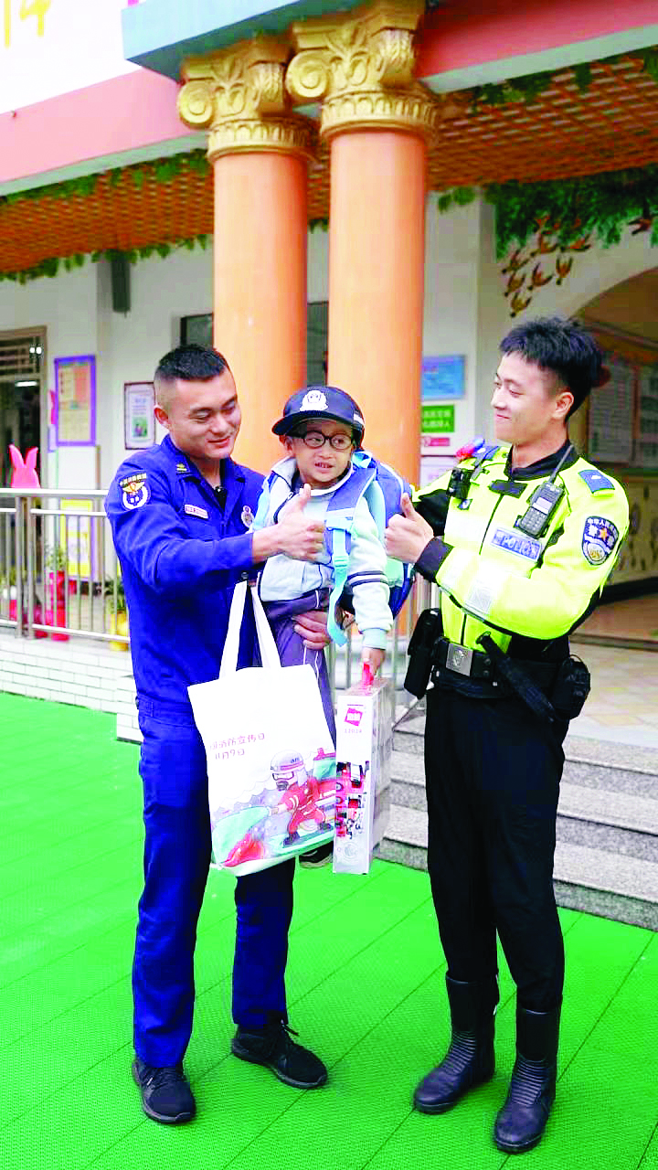 惠州交警聯(lián)合龍門消防為平平送去專屬兒童安全頭盔、玩具消防車和書包,邀請他到交警大隊消防大隊參觀體驗