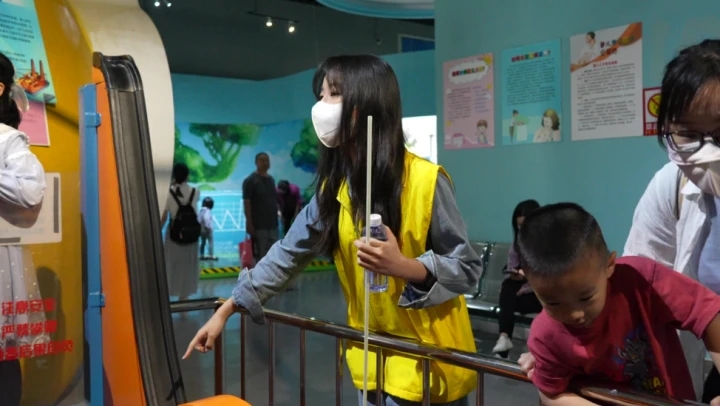 5月2日上午9:45,惠州科技館剛開放15分鐘,就迎來了眾多市民游客。9名志愿者在開館前就已經(jīng)就位,在各自負責的區(qū)域里為市民游客提供志愿服務。大三學生江穎負責的區(qū)域是科技館一樓大廳,這也是游客們到達的第一站,她在這里維持參觀秩序,回答游客的咨詢,幫助有需要的游客!盎久刻於家1.5萬步以上,4月30日那天人最多,我走了2萬多步。”江穎說,她高考之后就經(jīng)常利用節(jié)假日做志愿服務,如今志愿服務時長已經(jīng)超過400個小時了。