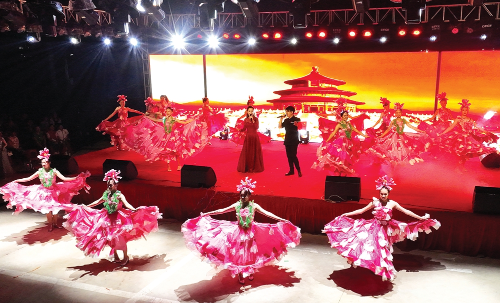 活動在舞蹈《繁花似錦》中拉開序幕,隨后一場令人熱血沸騰的燈光秀吸引了全場觀眾的注意,掀起了第一浪高潮。接著,舞蹈《萬疆》、古箏《盛世國樂》、客家舞蹈《茶香中國》、歌曲《海闊天空》、小丑歡樂雜耍、魔術(shù)《大變活人》等10余個節(jié)目輪番上演。優(yōu)美的舞蹈、幽默的雜耍、激情的搖滾樂讓整場文藝演出亮點不斷,高潮迭起。演出中還穿插了有獎問答、舞蹈互動等環(huán)節(jié),進一步活躍了現(xiàn)場氣氛,喝彩聲、掌聲此起彼伏。