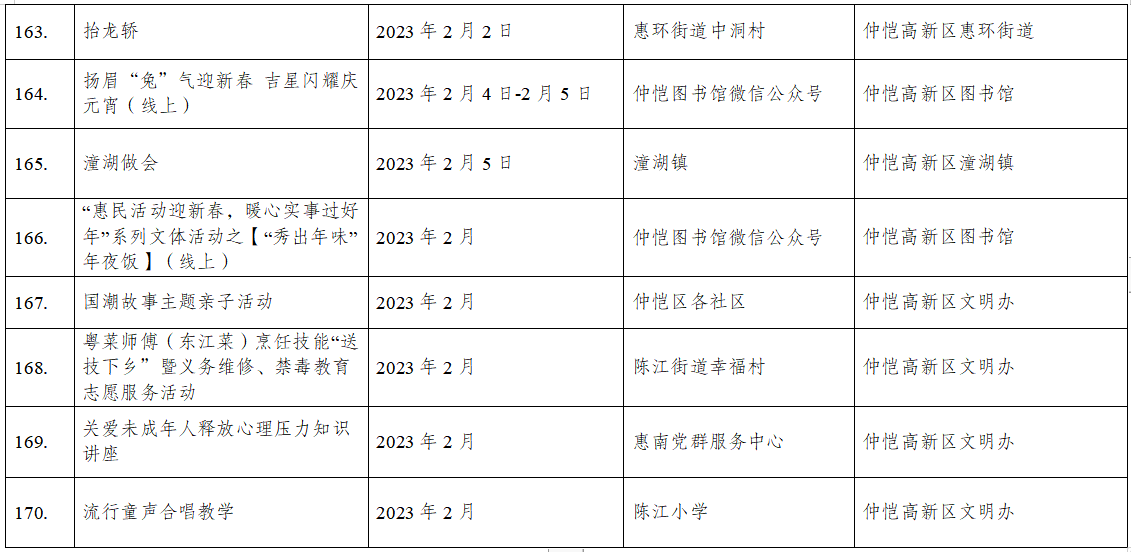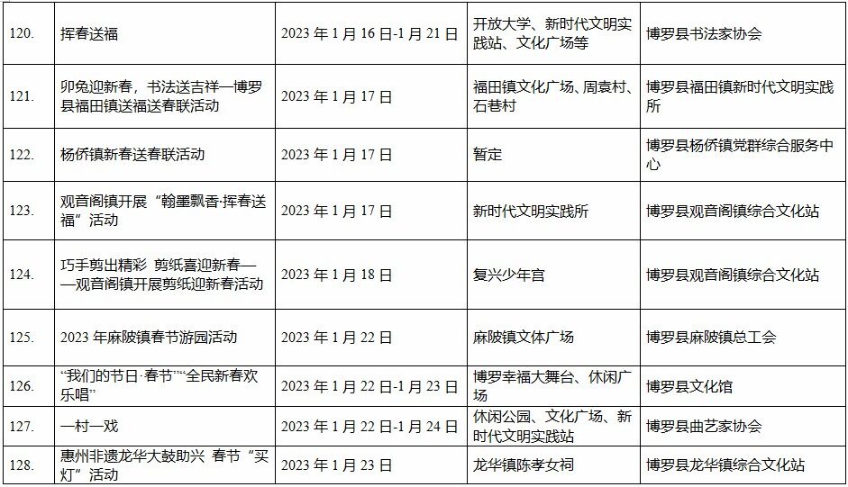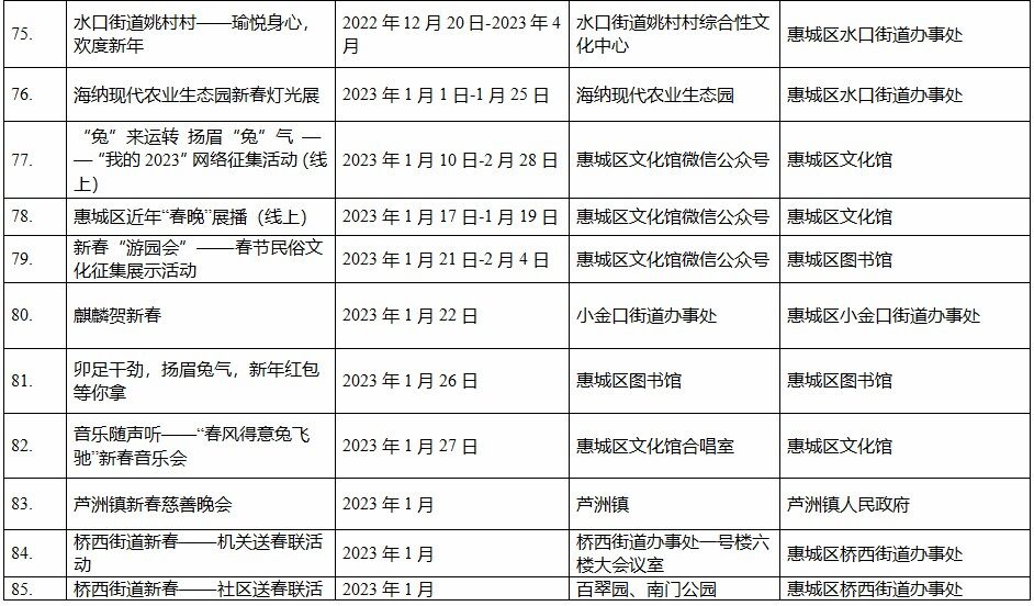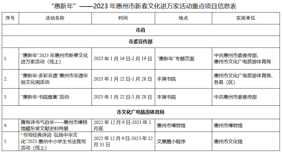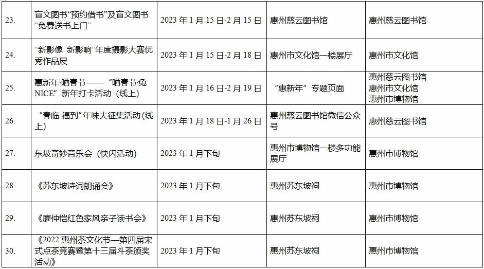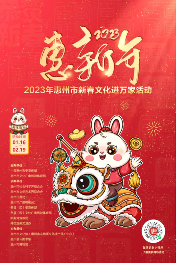 到各大公共文化場館打卡、參加線上線下各類文化活動、感受傳統(tǒng)中國年味、云上賞戲劇……1月15日,記者從市委宣傳部獲悉,“惠新年”——2023年惠州市新春文化進(jìn)萬家活動將于1月16日全面啟動;顒訉⒊掷m(xù)到2月19日,覆蓋整個農(nóng)歷新年,惠州市委宣傳部將統(tǒng)籌組織各縣(區(qū))、市直宣傳文化單位力量,開展逾170場主題線上線下活動,進(jìn)一步營造喜慶、團結(jié)、祥和的節(jié)慶氛圍,讓廣大市民游客在惠過年游得舒心、玩得盡興。