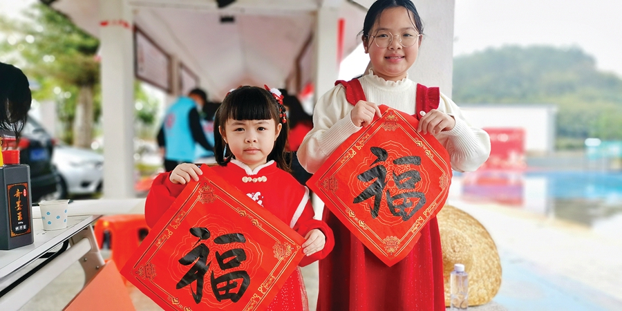 聽到有送春聯(lián)活動,5歲的羅佳怡(左)和10歲的表姐黃文靜特意換上過年的新衣服來到活動現(xiàn)場。