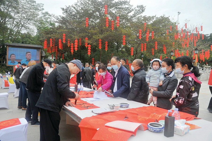 1月8日,羅浮山景區(qū)舉辦“翰墨飄香 揮春送!蔽幕菝窕顒樱埗嗝、市書法家協(xié)會的書法家揮毫潑墨,為群眾、游客送“福”送“順”送春聯(lián)。