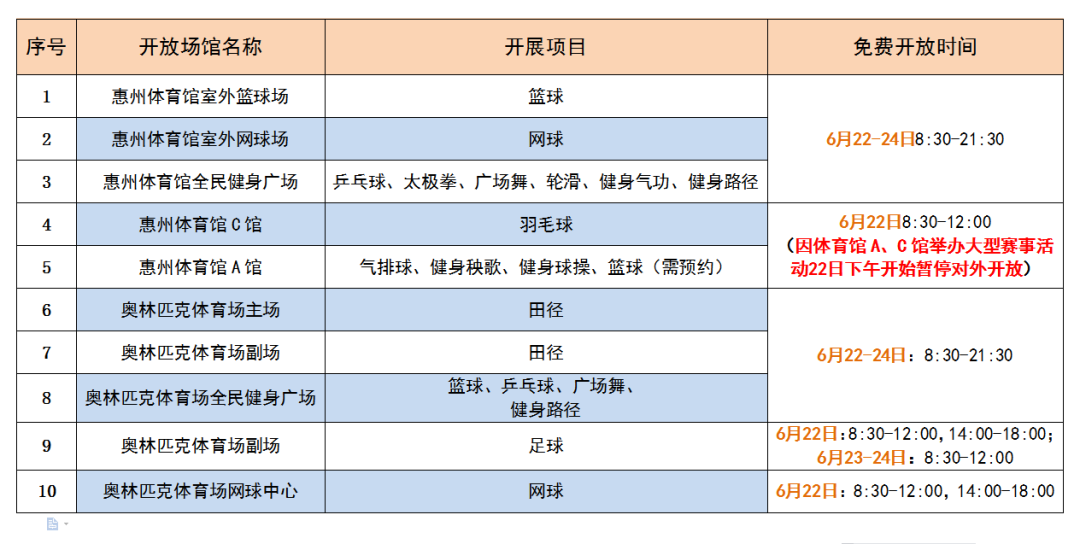 注:端午節(jié)期間因惠州體育館(A、C館)舉辦大型賽事活動(dòng),22日下午開始暫停對(duì)外開放: