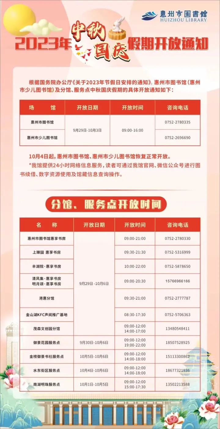 2023年中秋國慶將至,為深入推進全民閱讀工作,豐富市民讀者的節(jié)日文化生活,9月25日,記者從惠州市圖書館獲悉,該館中秋國慶假期精心準備了30項共36場閱讀推廣活動,靜候廣大市民前來品書香、享閱讀。具體活動詳情請關(guān)注“惠州市圖書館”微信號。