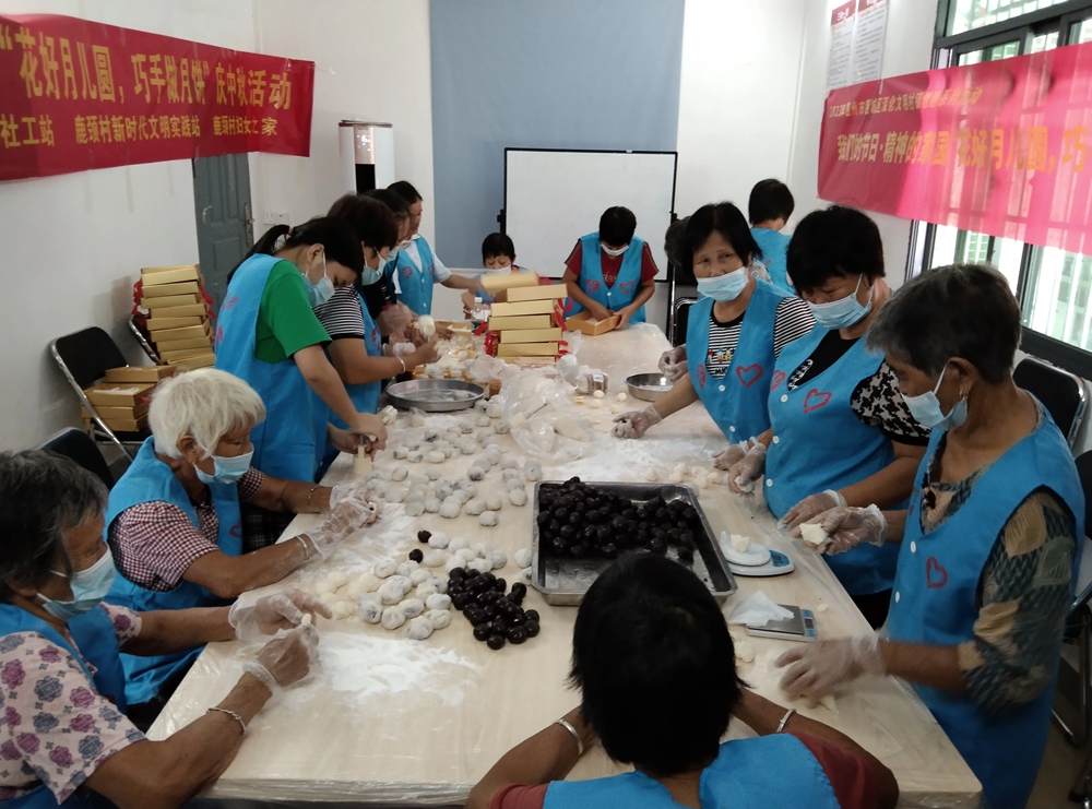 活動(dòng)當(dāng)天,“雙百”社工和志愿者們?cè)缭鐏?lái)到鹿頸村中的活動(dòng)室,打掃衛(wèi)生、布置好場(chǎng)地、觀看冰皮月餅的制作過(guò)程,然后分工合作,在大家的共同努力下制作了800個(gè)月餅。隨后,把制作好的月餅分裝,再由志愿者和“雙百”社工分批把剛出爐的月餅送給村中的困難群眾手中。