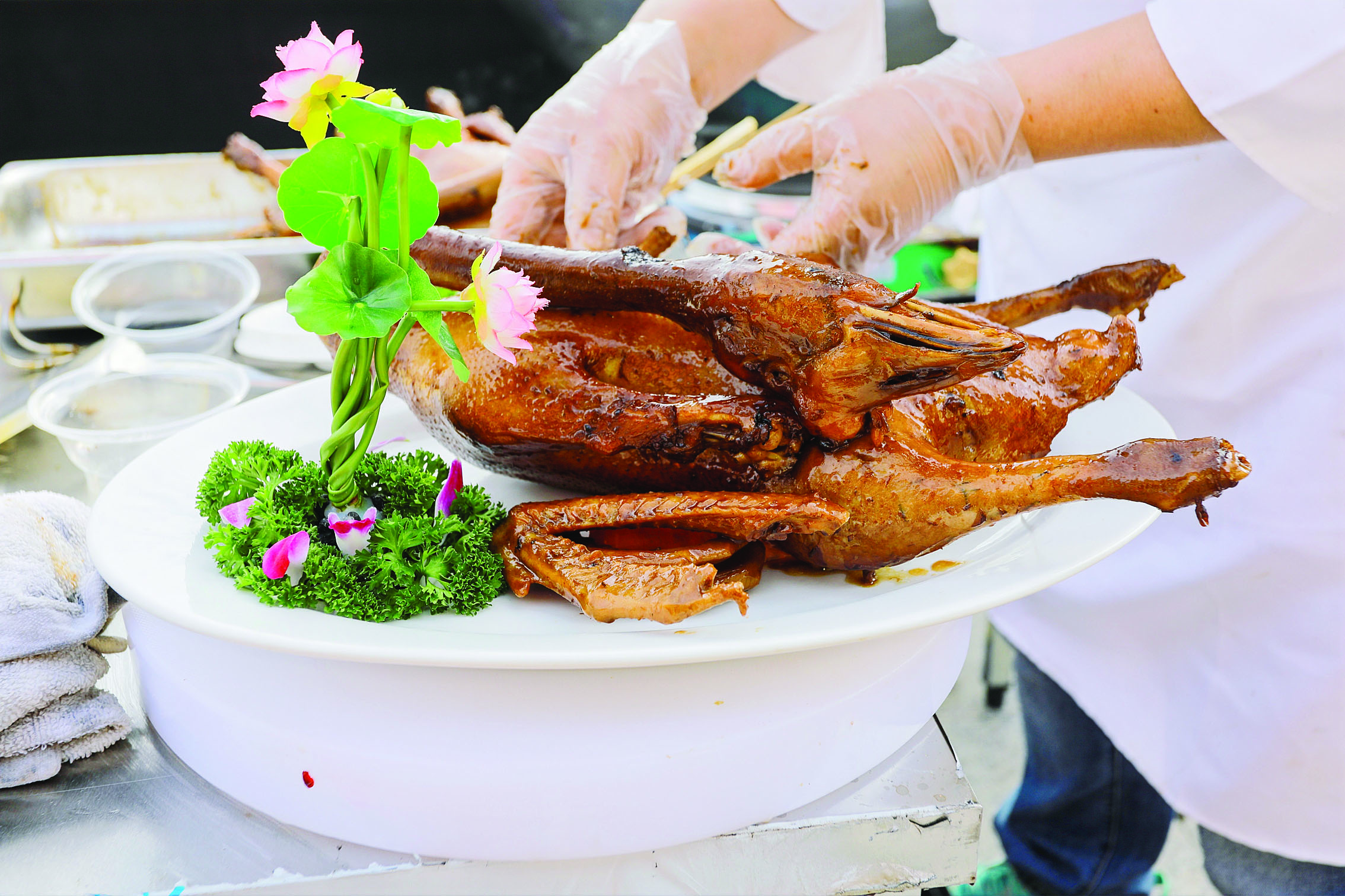 “瀝林現(xiàn)有碌鵝技藝人近50人,每年僅珠三角地區(qū)慕名來(lái)吃碌鵝的人數(shù)就達(dá)到10萬(wàn)人次!睘r林鎮(zhèn)黨委副書(shū)記陽(yáng)青祝介紹,舉辦此次碌鵝節(jié),旨在以鵝為媒、以節(jié)聚勢(shì),匯聚賞鵝、品鵝的人氣及商氣,以形成具有地域特色的煙火文化、街頭文化、美食文化,匯聚鄉(xiāng)村振興“鵝”力量,唱響瀝林“百千萬(wàn)工程”最強(qiáng)音。