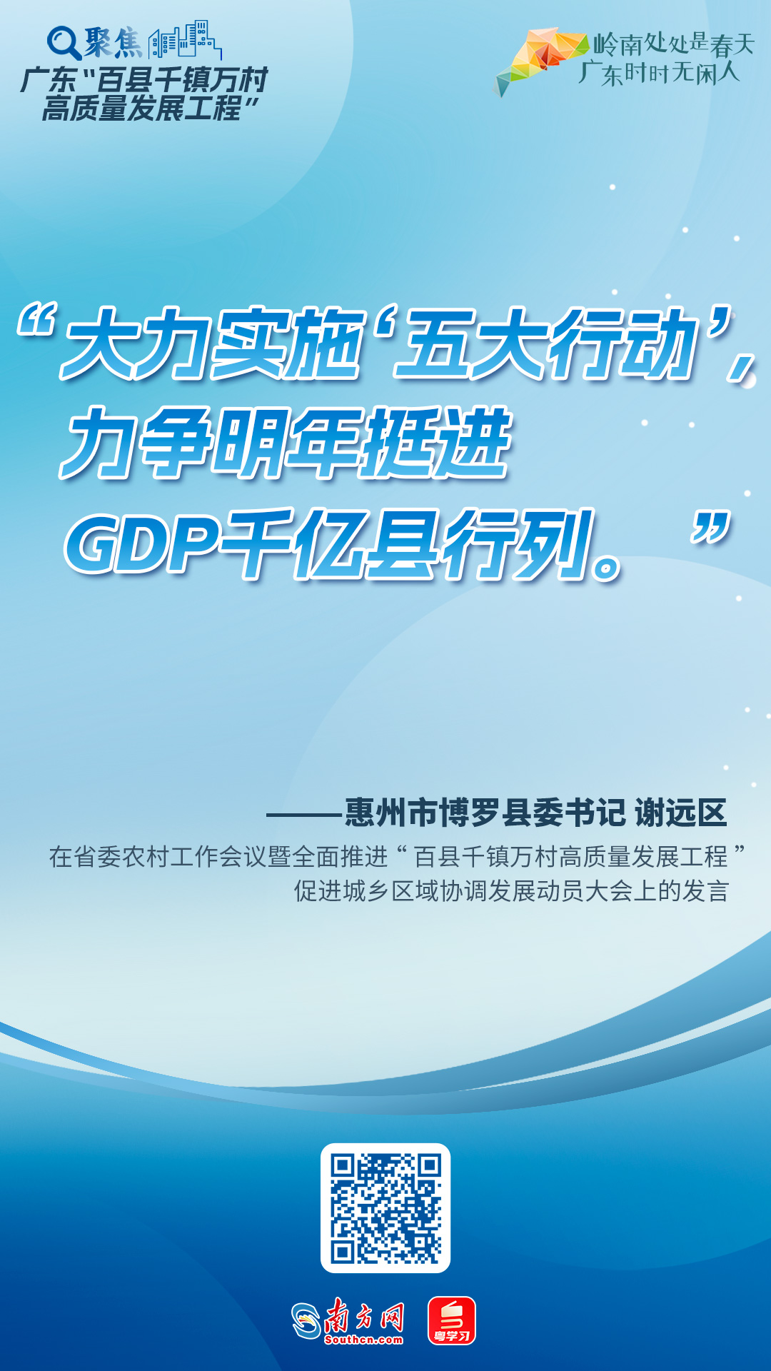 惠州市博羅縣委書記謝遠(yuǎn)區(qū)表示,博羅縣將深入貫徹落實(shí)黨的二十大精神,全面落實(shí)省委決策部署,堅(jiān)持制造業(yè)當(dāng)家,大力實(shí)施“五大行動(dòng)”,奮力譜寫縣域振興新篇章,力爭(zhēng)今年GDP突破900億元、明年挺進(jìn)GDP千億縣行列、后年進(jìn)入全國(guó)百?gòu)?qiáng)縣65位左右。