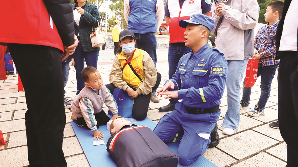 學雷鋒志愿服務集市上,志愿者正在為市民演示心肺復蘇。