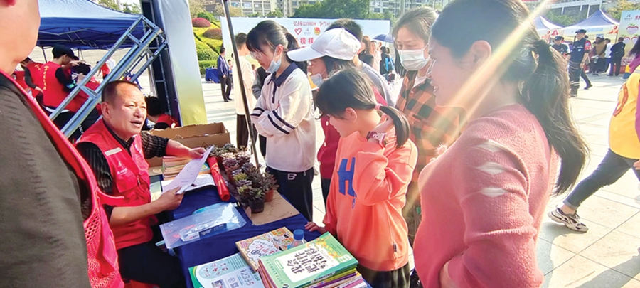 活動(dòng)現(xiàn)場(chǎng),以書換綠活動(dòng)吸引了不少學(xué)生;葜萑?qǐng)?bào)記者李芳娟 攝