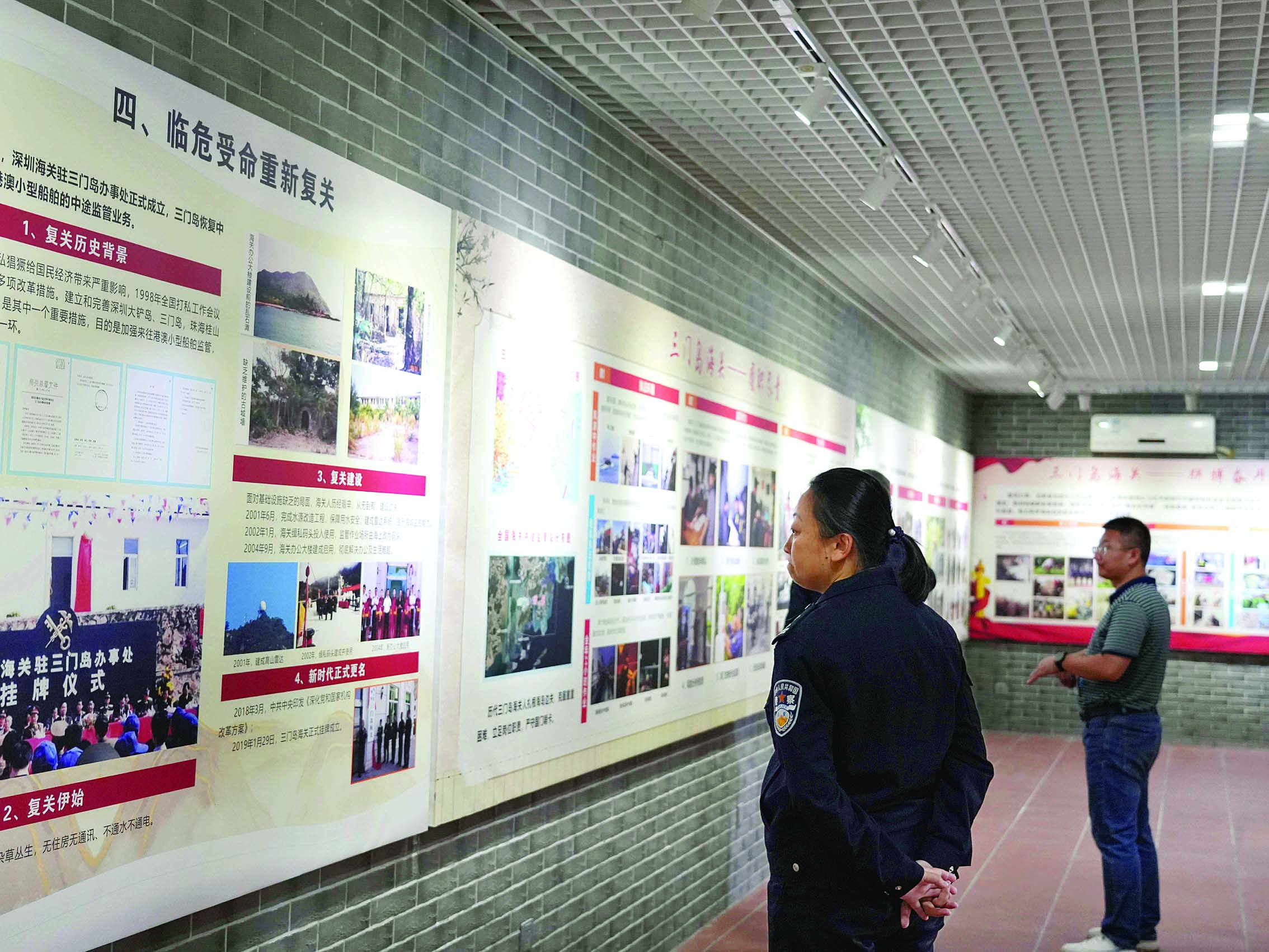 走進三門關(guān)史展覽室,墻上圖文并茂展示了三門島海關(guān)從清代開設關(guān)廠,一直到近年來科技助力海關(guān)開展進口監(jiān)管的歷史脈絡。館內(nèi)還展有建關(guān)初期使用的閘門、監(jiān)管船舶的瞭望鏡、監(jiān)管艇上的船用衛(wèi)星導航儀等老物件,生動展現(xiàn)了海關(guān)監(jiān)管技術(shù)的傳承和發(fā)展。