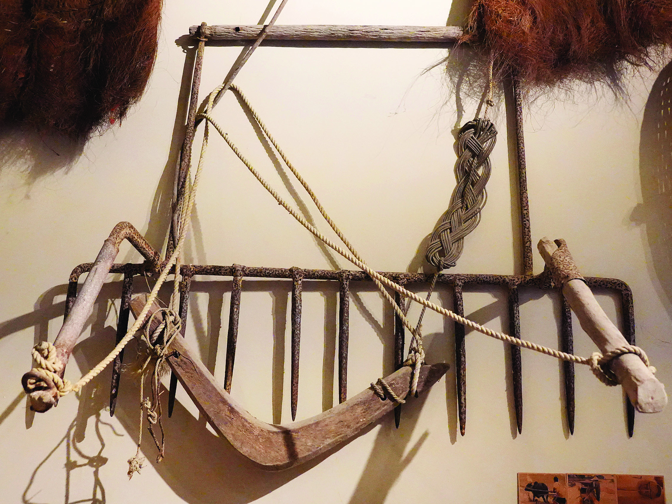 走進(jìn)溪美村史館,首先映入眼簾的是正中間的蓋子獅彩畫,栩栩如生;旁邊是一副上書“溪水雙合孕育千秋桑梓 美德長存福澤百世子孫”的對聯(lián);下方的展臺擺放著造型獨(dú)特的蓋子獅獅頭,格外顯眼。環(huán)顧四周,隨處可見農(nóng)耕老物件,如鋤頭、籮筐、犁耙、石磨、谷風(fēng)機(jī)等農(nóng)具,以及帶有年代感的桌椅、廚具等藏品近200件。