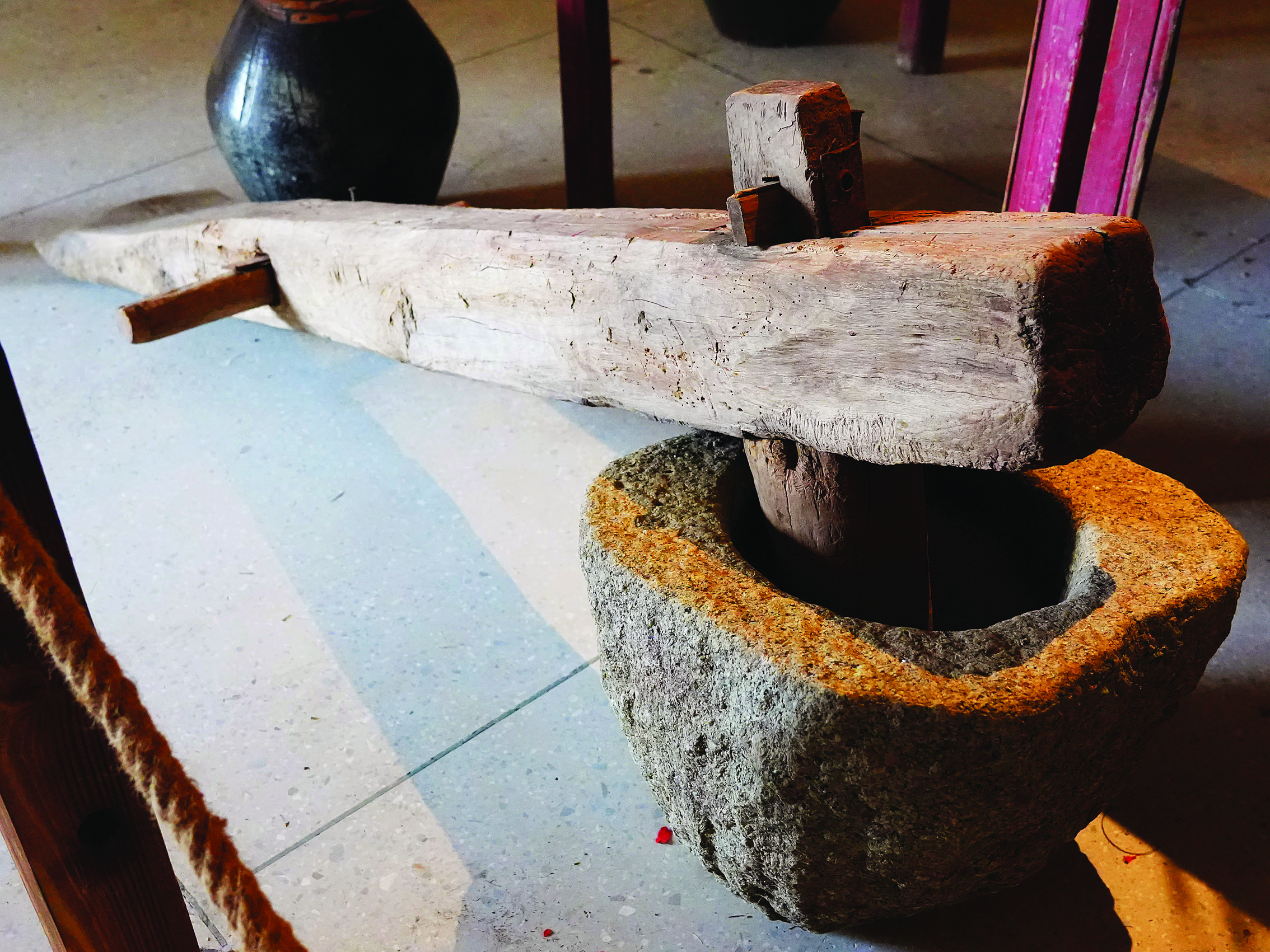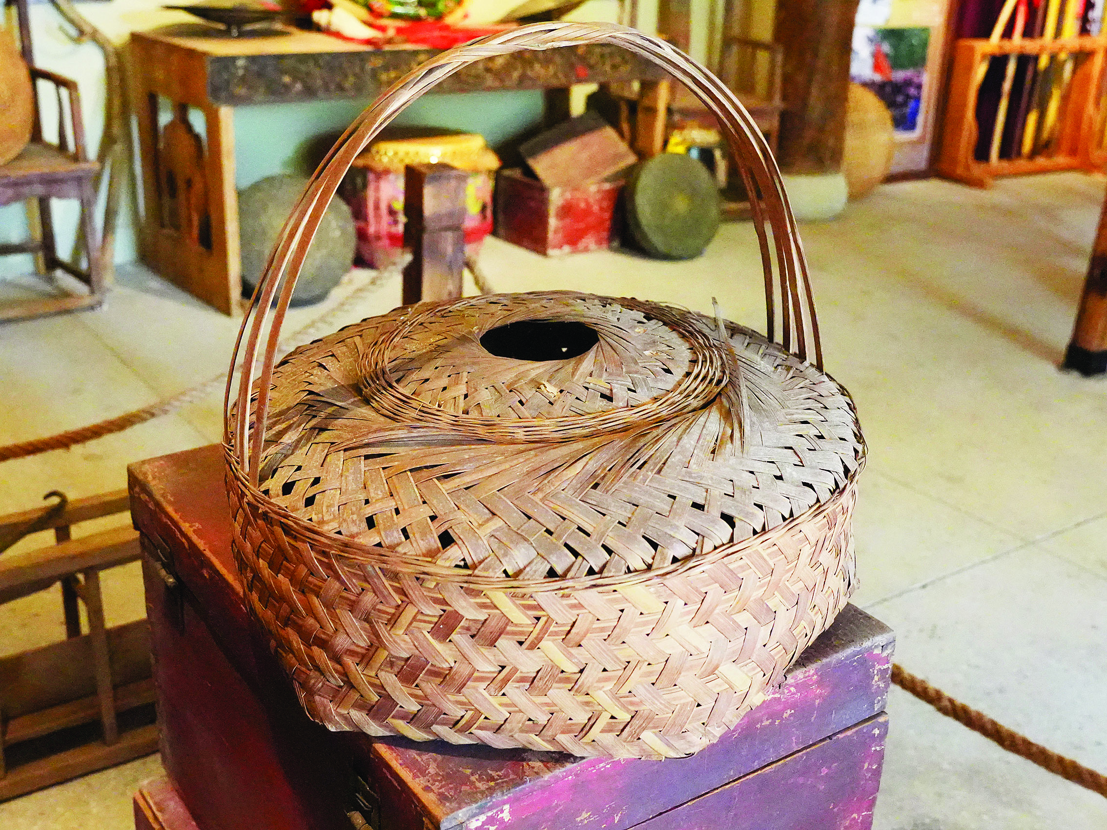 走進溪美村史館,首先映入眼簾的是正中間的蓋子獅彩畫,栩栩如生;旁邊是一副上書“溪水雙合孕育千秋桑梓 美德長存福澤百世子孫”的對聯(lián);下方的展臺擺放著造型獨特的蓋子獅獅頭,格外顯眼。環(huán)顧四周,隨處可見農(nóng)耕老物件,如鋤頭、籮筐、犁耙、石磨、谷風(fēng)機等農(nóng)具,以及帶有年代感的桌椅、廚具等藏品近200件。