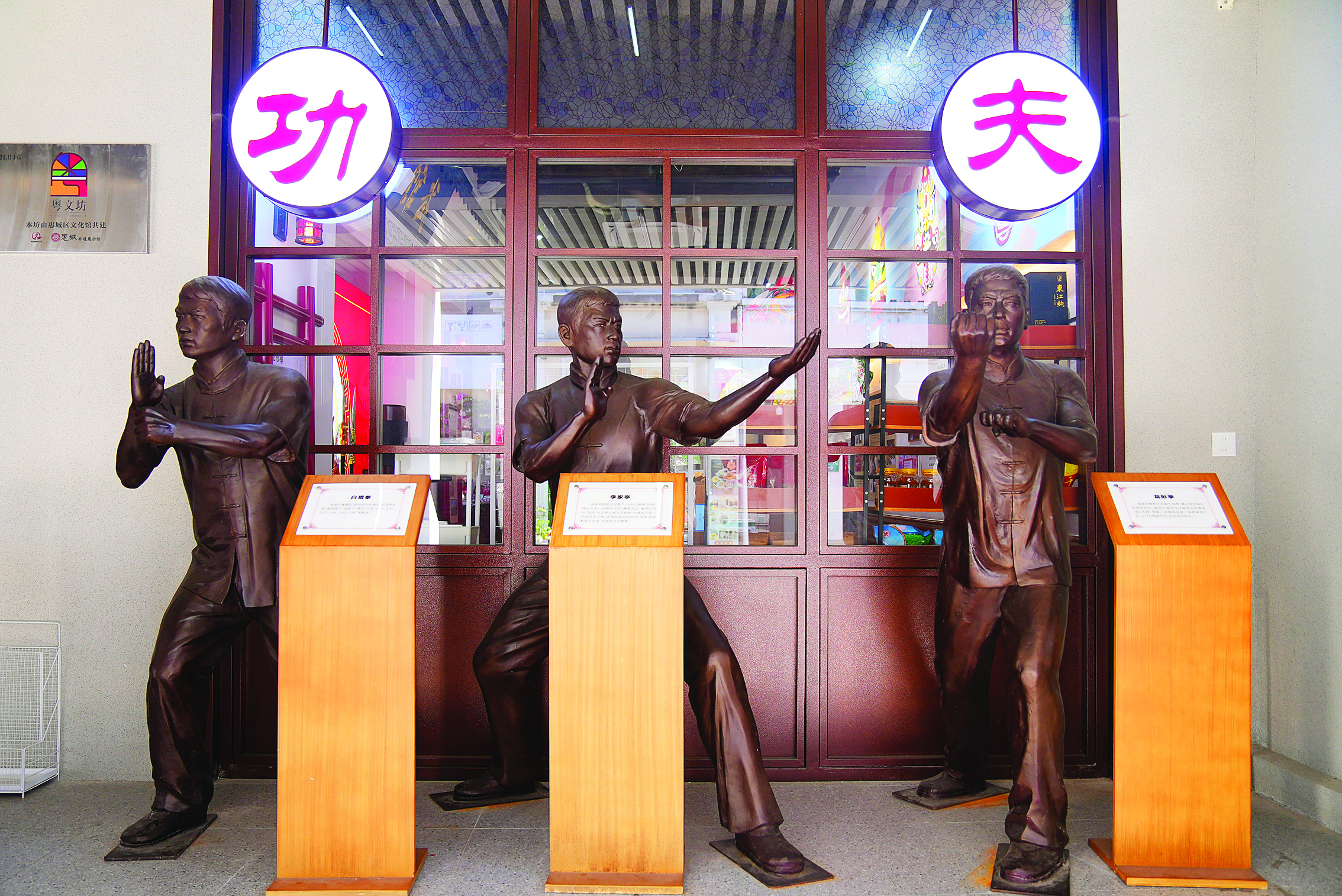 大門上方懸掛館名木匾,使用了惠州木雕,為該項非遺傳承人作品,純手工制作,古香古色。大門右側(cè)擺放一組功夫人像雕塑,分別為白眉拳、李家拳、龍形拳,是傳承于惠城的傳統(tǒng)拳種,雕塑栩栩如生,展現(xiàn)出拳術(shù)的特征和人物之精氣神。大門左側(cè)則為“天下麒!眻鼍,麒麟頭擺放其間,威猛又喜慶!镑梓胧侨皤F,小金口麒麟舞是省級非遺。我們把麒麟頭放在門口,是想給所有來賓帶來福氣。”周碧儀說。