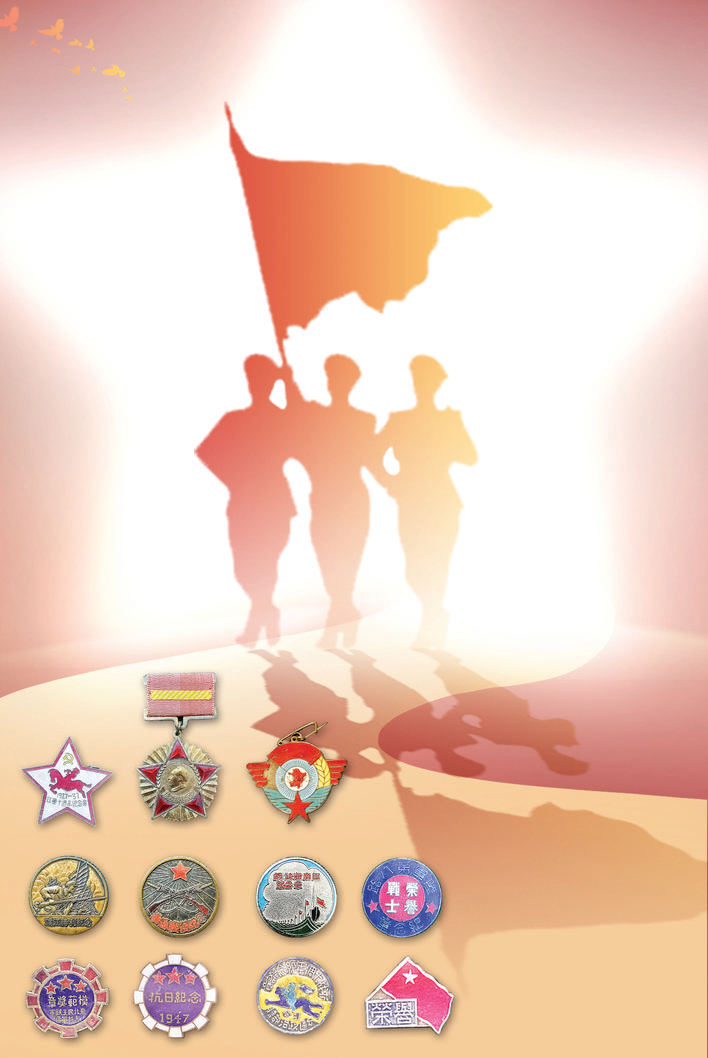 紅軍十周年紀念章。 抗美援朝紀念章。 解放東北紀念章。 渡江勝利紀念章。 淮海戰(zhàn)役紀念章。 解放海南島紀念章。 陸軍第八路榮譽戰(zhàn)士紀念章。