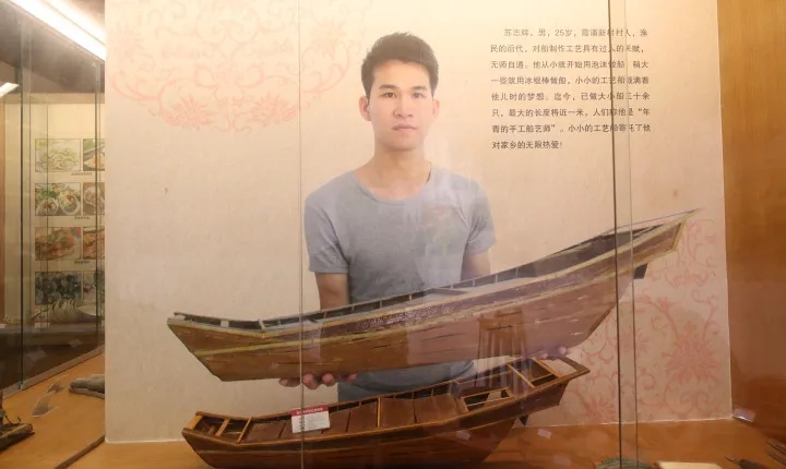 在古物中間還有個“新品”,一條長近1米的木質漁船模型,單獨占據一個展柜,“這是我們新村漁民后代‘90后’蘇志輝,根據家里船的樣子制作的!眲⒒壑易院赖亟榻B,蘇志輝從小在新村長大,對船有著特殊的感情,制船技藝精湛,在這位年輕的手工船藝師心中,小小的工藝船寄托了他對家鄉(xiāng)的無限熱愛。