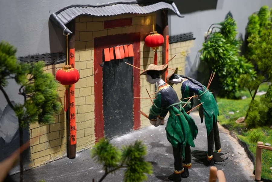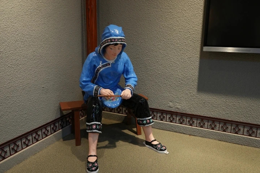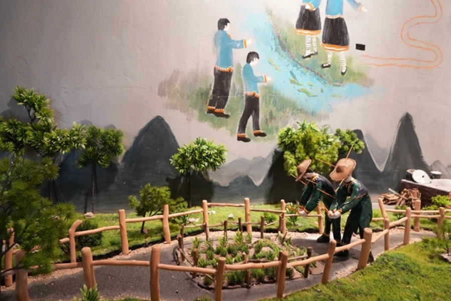尤其是“特色文化”部分,分別展示“舞火狗”、瑤族服飾、“織帶仔”技藝,既有微景觀,也有真物品!拔杌鸸贰钡娜凯h(huán)節(jié),通過微景觀塑造,呈現(xiàn)這個(gè)古老習(xí)俗的進(jìn)行時(shí)的狀態(tài),人物形象栩栩如生,引人入勝。