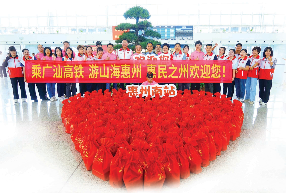 “乘廣汕高鐵,游山水惠州!惠州歡迎您!”游客一出站,志愿者們舉著歡迎標(biāo)語(yǔ)大聲喊出歡迎口號(hào),并為他們送上裝滿了各種零食的紅色福袋,吉他歌手則在現(xiàn)場(chǎng)演奏,美妙的音樂(lè)和熱烈的氣氛,讓不少旅客直呼驚喜。