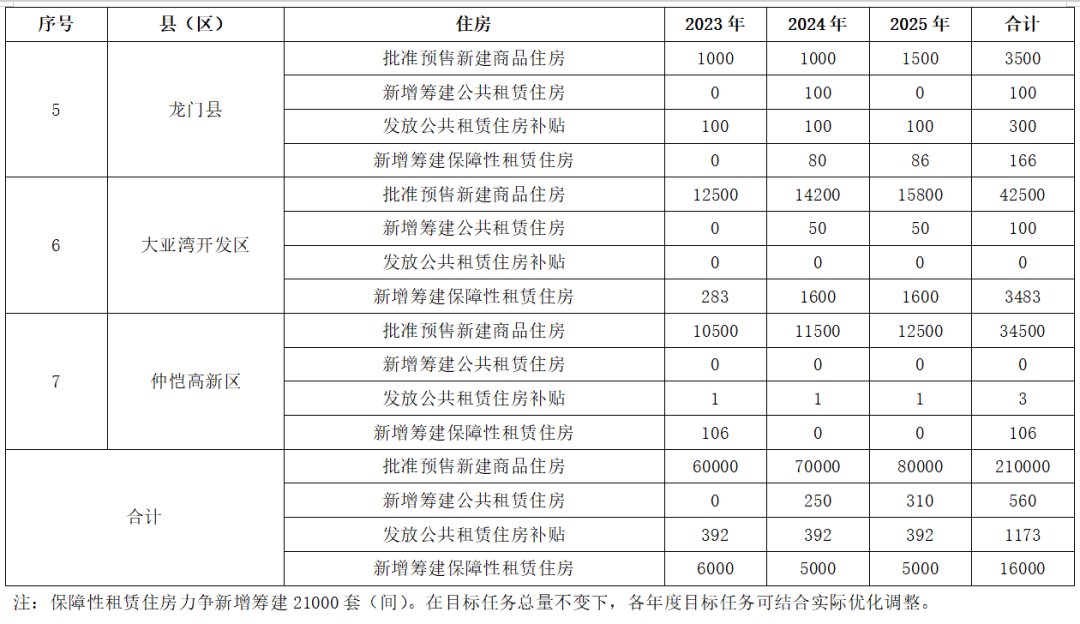 為2023至2025年全市批準(zhǔn)預(yù)售新建商品住房21萬套左右,招拍掛供應(yīng)住宅用地265公頃左右;新增籌建公共租賃住房560套,發(fā)放租賃補貼1173戶,新增籌建保障性租賃住房不少于16000套(間),力爭達到21000套(間);住房公積金新開戶職工人數(shù)34.25萬人,住房公積金新增繳存額170.86億元;新開工住宅綠色建筑面積占比達到100%,新增城鎮(zhèn)老舊小區(qū)改造300個,為我市打造成為珠江東岸新增長極、粵港澳大灣區(qū)高質(zhì)量發(fā)展重要地區(qū)和更加幸福國內(nèi)一流城市提供有力支撐。以上目標(biāo)任務(wù)均與省城鎮(zhèn)住房發(fā)展“十四五”規(guī)劃進行了銜接。
