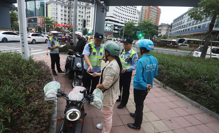 當(dāng)日下午5時(shí)許,記者在市區(qū)鵝嶺南路與鵝嶺西路交會(huì)路口發(fā)現(xiàn),一些“摩電”駕乘人員還是存在不戴安全頭盔、隨意變道、逆行等交通違法行為。不久,一輛電動(dòng)自行車(chē)沿鵝嶺西路由西往東行駛,駕乘人員因未佩戴安全頭盔被執(zhí)勤交警攔下進(jìn)行教育、處罰!邦^盔忘在家里了,下次一定注意!瘪{駛員王先生認(rèn)為,駕駛摩托車(chē)、電動(dòng)自行車(chē)不戴安全頭盔,確實(shí)有一定的危險(xiǎn)性。