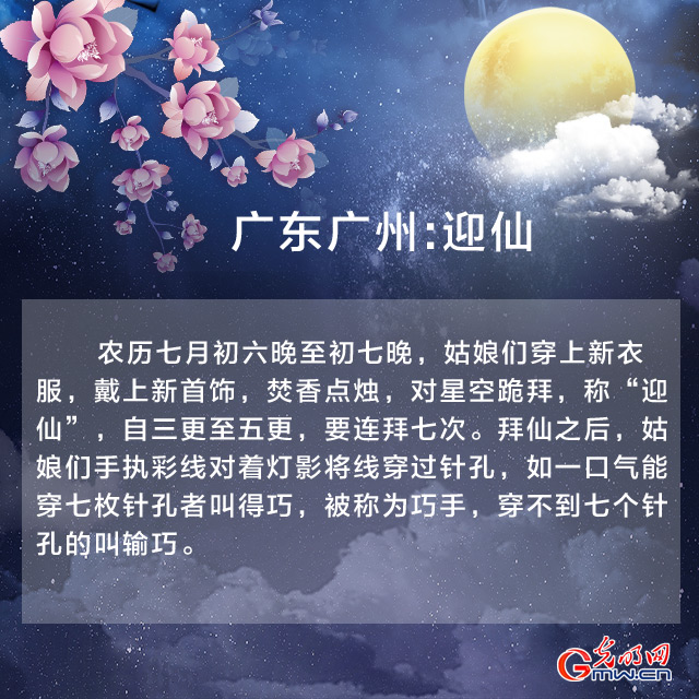 農(nóng)歷七月初六晚至初七晚,姑娘們穿上新衣服,戴上新首飾,焚香點(diǎn)燭,對星空跪拜,稱為“迎仙”,自三更至五更,要連拜七次。拜仙之后,姑娘們手執(zhí)彩線對著燈影將線穿過針孔,如一口氣能穿七枚針孔者叫得巧,被稱為巧手,穿不到七個針孔的叫輸巧。