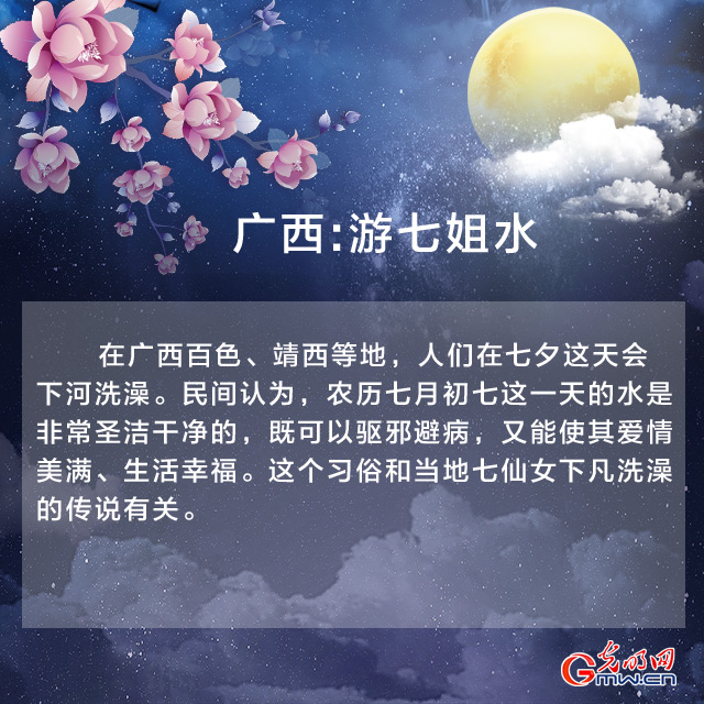 在廣西百色、靖西等地,人們在七夕這天會下河洗澡。民間認(rèn)為,農(nóng)歷七月初七這一天的水是非常圣潔干凈的,既可以驅(qū)邪避病,又能使其愛情美滿、生活幸福。這個習(xí)俗和當(dāng)?shù)仄呦膳路蚕丛璧膫髡f有關(guān)。