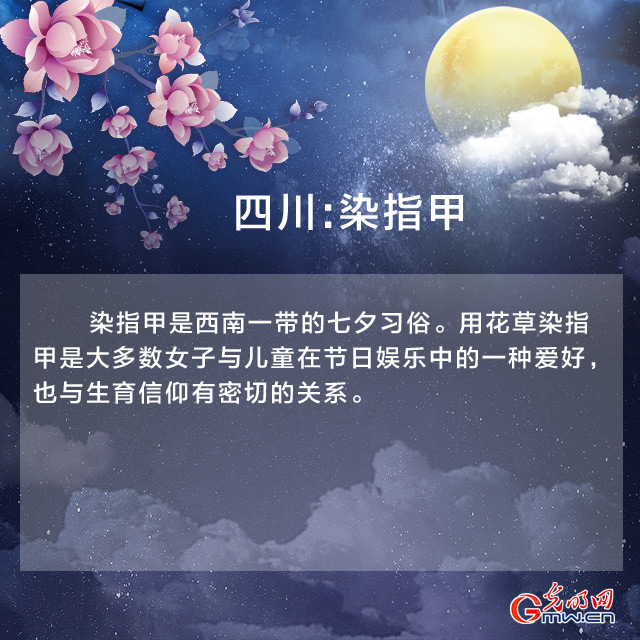 染指甲是西南一帶的七夕習(xí)俗。用花草染指甲是大多數(shù)女子與兒童們在節(jié)日娛樂中的一種愛好,也與生育信仰有密切的關(guān)系。