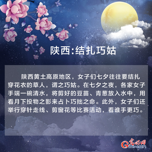 陜西黃土高原地區(qū),女子們七夕往往要結(jié)扎穿花衣的草人,謂之巧姑。在七夕之夜,各家女子手端一碗清水,將剪好的豆苗、青蔥放入水中,用看月下投物之影來占卜巧拙之命。此外,女子們還舉行穿針走線、剪窗花等比賽活動,看誰手更巧。