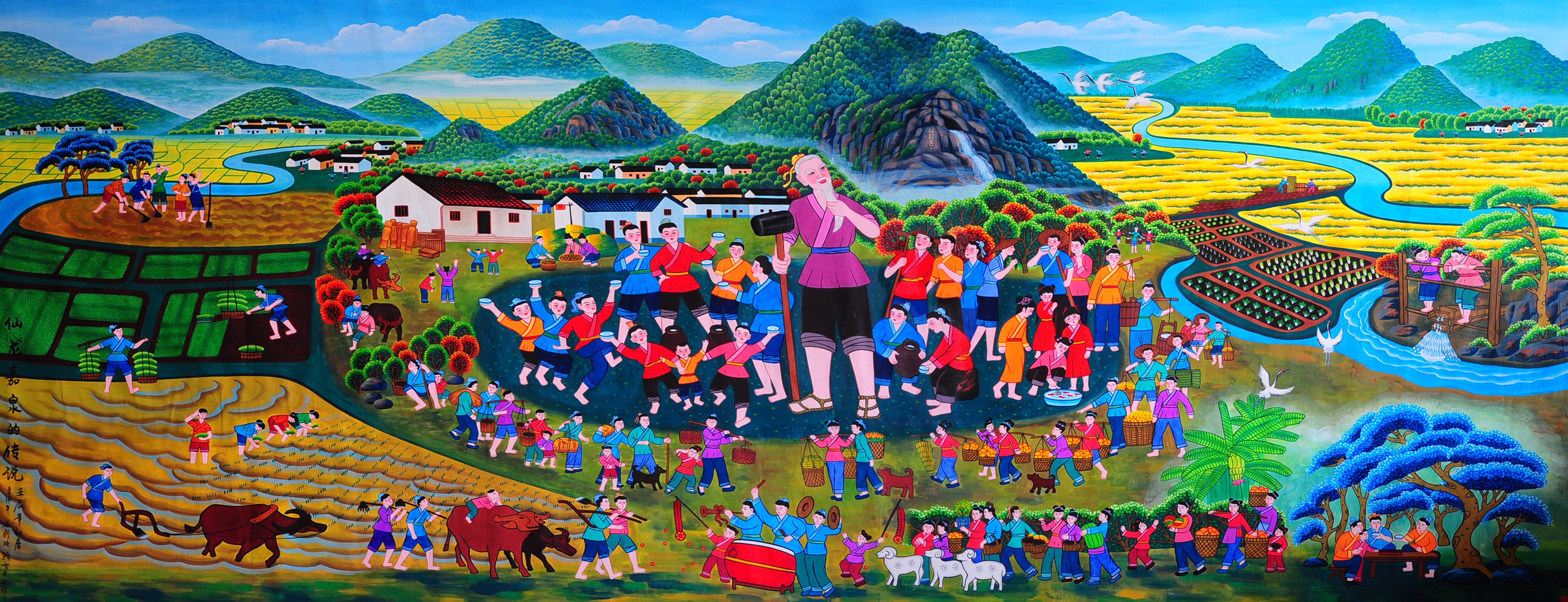 龍門農(nóng)民畫《仙龍嘉泉的傳說》,展現(xiàn)王賓風(fēng)情。 黃偉平、梁彩歡、駱雪芳繪;葜萑?qǐng)?bào)記者侯縣軍 翻拍