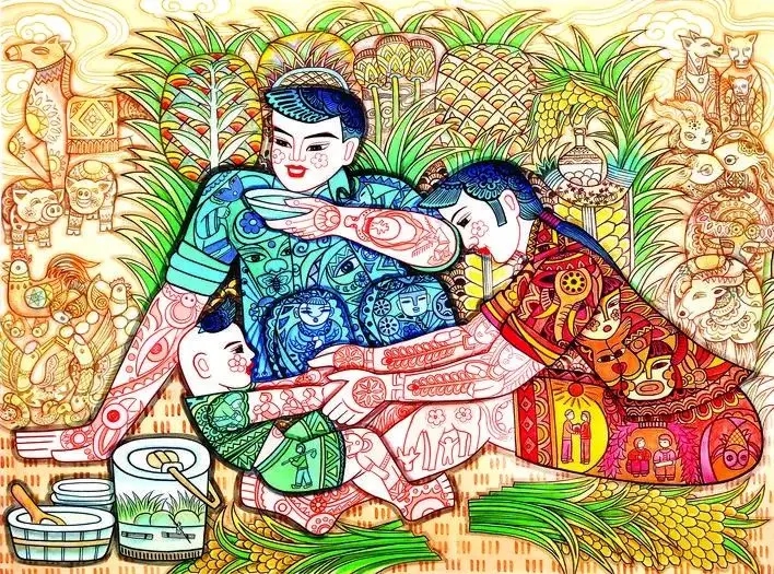 龍門農(nóng)民畫畫家黃偉平、劉少夏作品《豐樂年》,展現(xiàn)藍田嘗新節(jié)場景;葜萑請筚Y料圖片