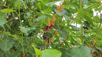 這個(gè)時(shí)候還是桑葚收成的季節(jié)。摘下一顆紅得發(fā)紫的桑葚,長(zhǎng)條的形狀與毛毛蟲(chóng)頗有幾分相似。放入口中輕輕一咬,色如紅酒的果汁從飽滿的顆粒中飛濺而出,清甜的味道透過(guò)味蕾瞬間傳遞至大腦。桑葚還可以制成果醬、桑葚酒等副產(chǎn)品。