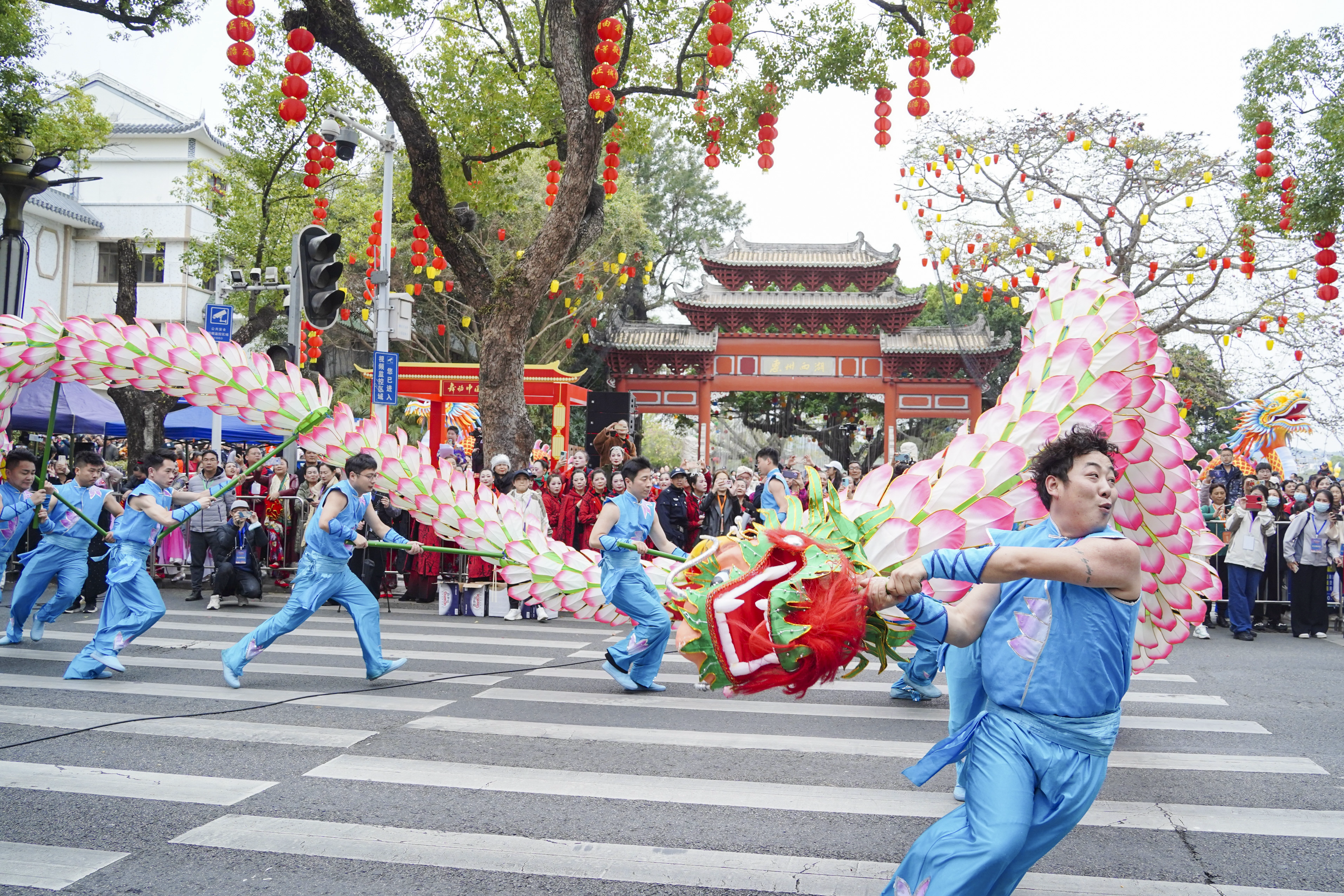 造型夸張的重慶銅梁龍舞、舞姿變化多端的浙江長(zhǎng)興百葉龍、與幾十名擊鼓者同舞的湖北云夢(mèng)三節(jié)龍、起源于宋代的安徽手龍舞、被譽(yù)為“東方活龍”的四川瀘州雨壇彩龍,以及來自惠州本土的惠東蓋子獅、鐵場(chǎng)鄒氏醒獅等,這方唱罷,那方登場(chǎng)。當(dāng)晚,這場(chǎng)精彩的龍舞大巡游還登上了央視新聞聯(lián)播。