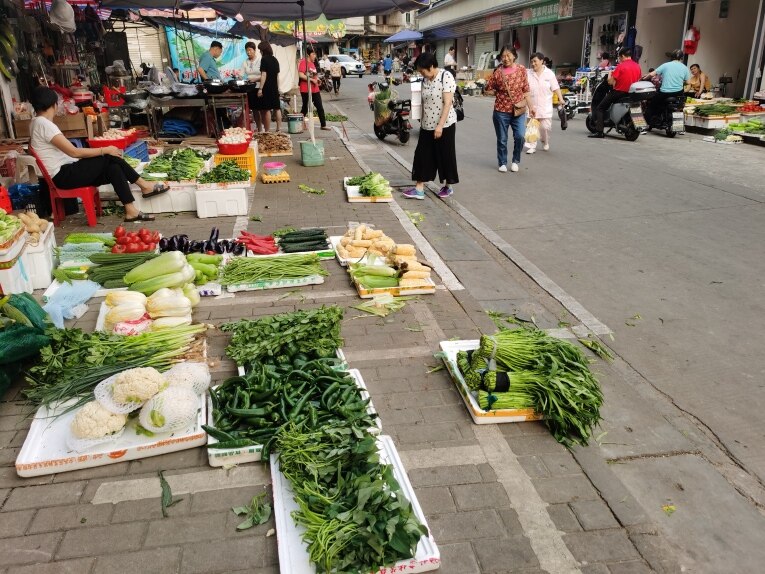 隨后,記者在惠城區(qū)河南岸街道斑樟湖一橫街看到,幾名商販把蔬菜水果等擺在機(jī)動車道上。當(dāng)時正值上下班高峰,陸續(xù)有汽車、電動車避讓通過。
