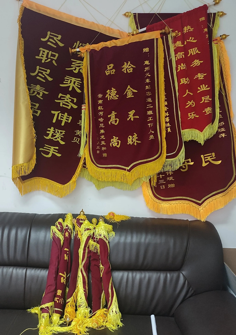 隨著春運(yùn)到來(lái),乘車返家的旅客越來(lái)越多,這樣溫馨的場(chǎng)景也在惠州火車站頻頻出現(xiàn)。走進(jìn)車站客運(yùn)辦公室,掛滿整墻的錦旗讓記者肅然起敬,細(xì)細(xì)一數(shù)足足有24面。每一面錦旗的背后,都是一個(gè)溫暖的春運(yùn)故事。這些錦旗是旅客們對(duì)劉葉春和同事們優(yōu)質(zhì)服務(wù)的褒獎(jiǎng)。