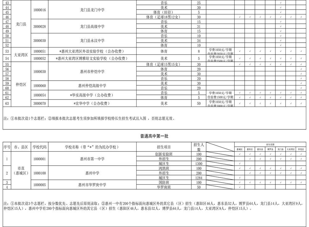 今年除個別學校外,全市民辦普通高中公辦生和民辦收費生繼續(xù)面向全市招生。同時,為進一步推動普通高中特色多樣化發(fā)展,各普通高中學校特長生計劃招生2309人,其中市直普通高中特長生全部面向全市招生?h(區(qū))公辦普通高中特長生招生方面,除了惠東平山中學(女子籃球)、博羅華僑中學(籃球)、龍門中學(體育足球)、仲愷中學(體育足球)4個項目外,其他縣(區(qū))公辦高中特長生均在屬地招生。