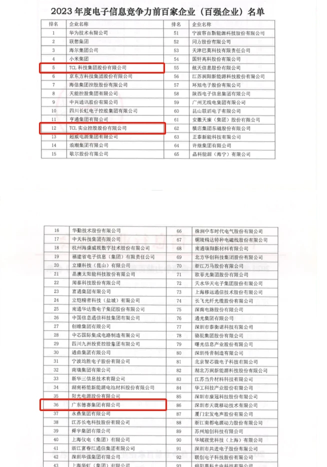 近日,中國(guó)電子信息行業(yè)聯(lián)合會(huì)在廈門(mén)發(fā)布2023年度電子信息企業(yè)競(jìng)爭(zhēng)力報(bào)告及前百家企業(yè)名單,惠州3家企業(yè)入選。其中TCL科技穩(wěn)居榜單第5位,TCL實(shí)業(yè)首次上榜名列第12位,廣東德賽集團(tuán)有限公司位列第36位。