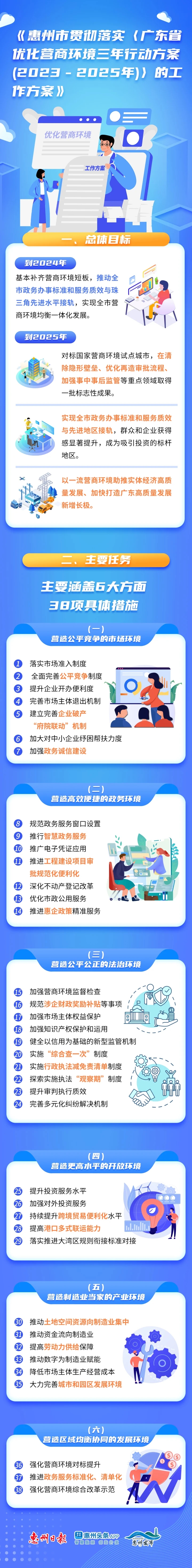 細化38項具體措施、支持制造業(yè)當家、2025年主要指標達到廣深水平……近日,我市出臺《惠州市貫徹落實〈廣東省優(yōu)化營商環(huán)境三年行動方案(2023-2025年)〉的工作方案》(以下簡稱《工作方案》),從今年開始到2025年,持續(xù)打造穩(wěn)定公平透明、可預期的營商環(huán)境,建設統(tǒng)一大市場,全力保護和培育市場主體,更大程度激發(fā)市場主體活力。