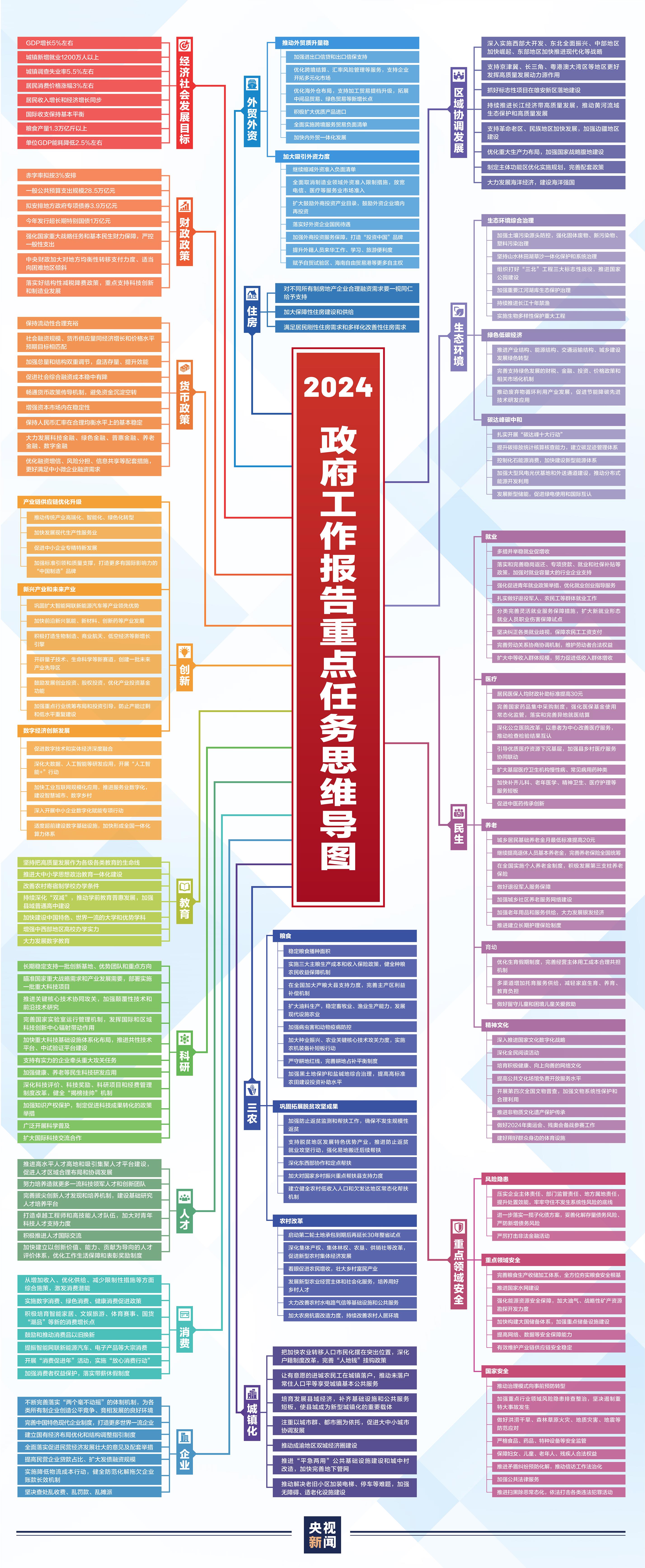 今年政府工作報告,提出了2024年發(fā)展主要預期目標和政府工作任務,涉及科技創(chuàng)新、教育、人才培養(yǎng)、消費、住房等多個方面。通過一張思維導圖,一起來全面了解 ↓