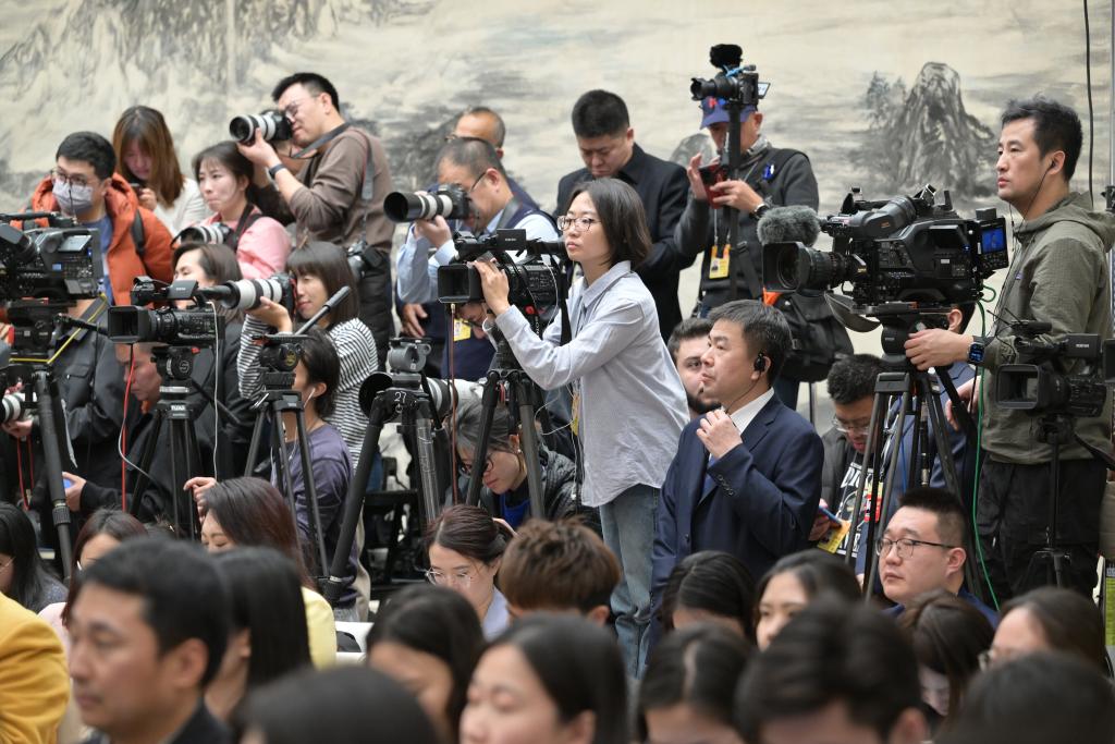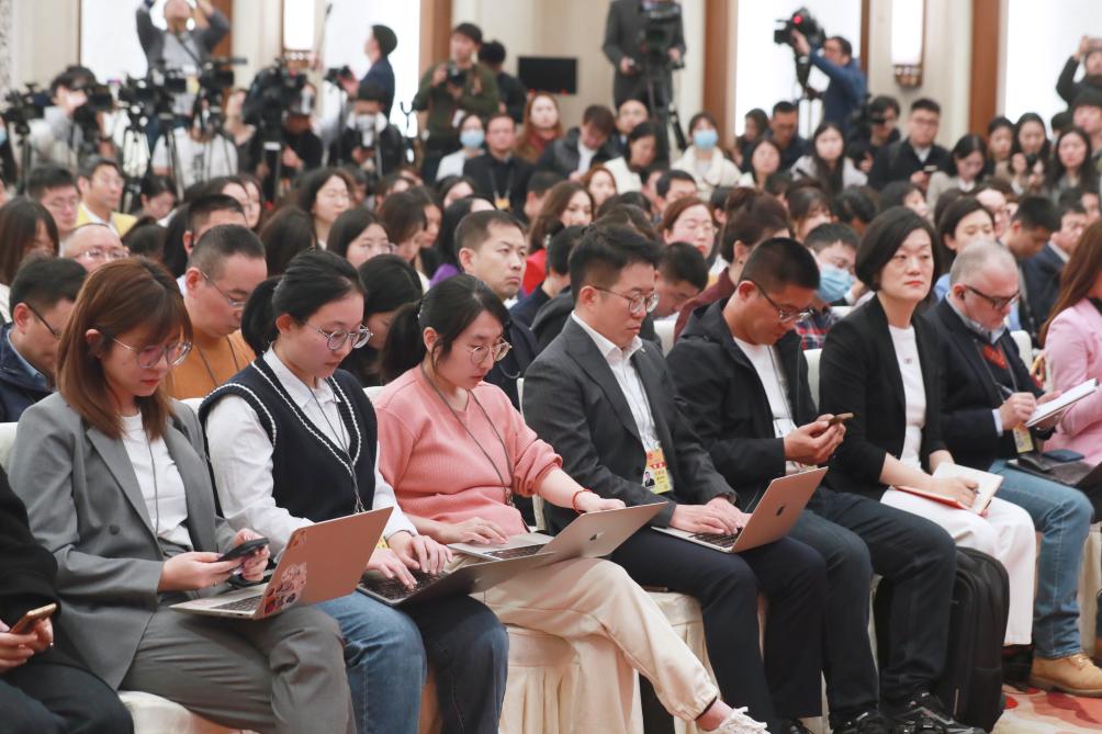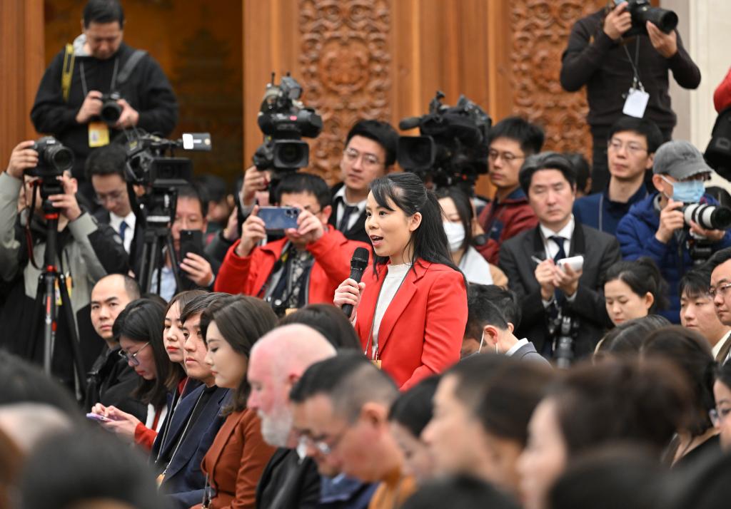 3月4日,十四屆全國人大二次會議在北京人民大會堂舉行新聞發(fā)布會。大會發(fā)言人婁勤儉就大會議程和人大工作相關問題回答中外記者的提問。這是記者在發(fā)布會上采訪。