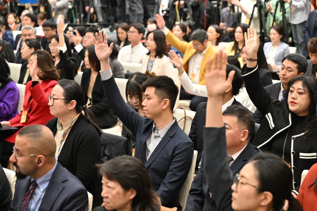 3月4日,十四屆全國人大二次會議在北京人民大會堂舉行新聞發(fā)布會。大會發(fā)言人婁勤儉就大會議程和人大工作相關問題回答中外記者的提問。這是記者舉手提問。