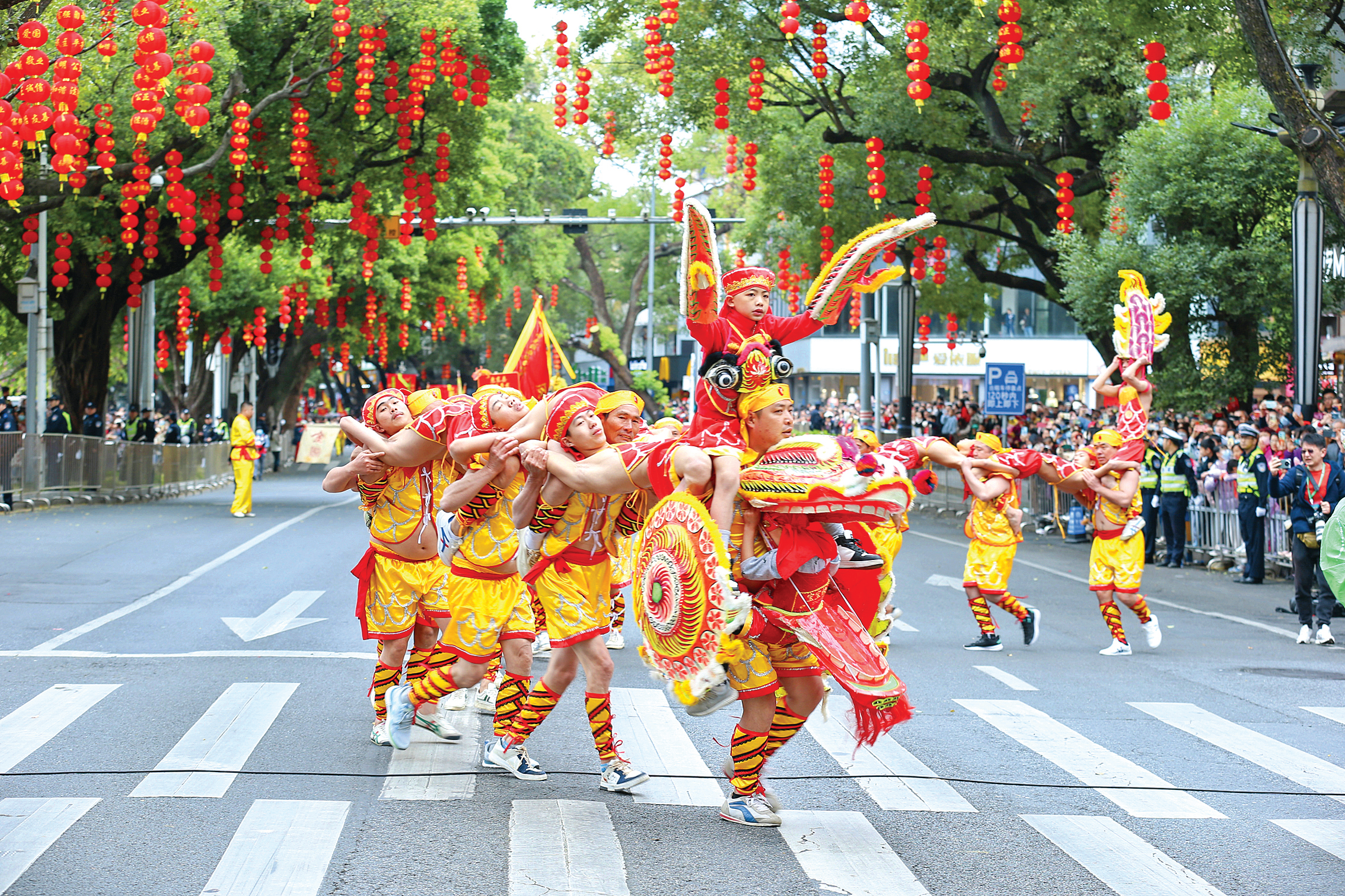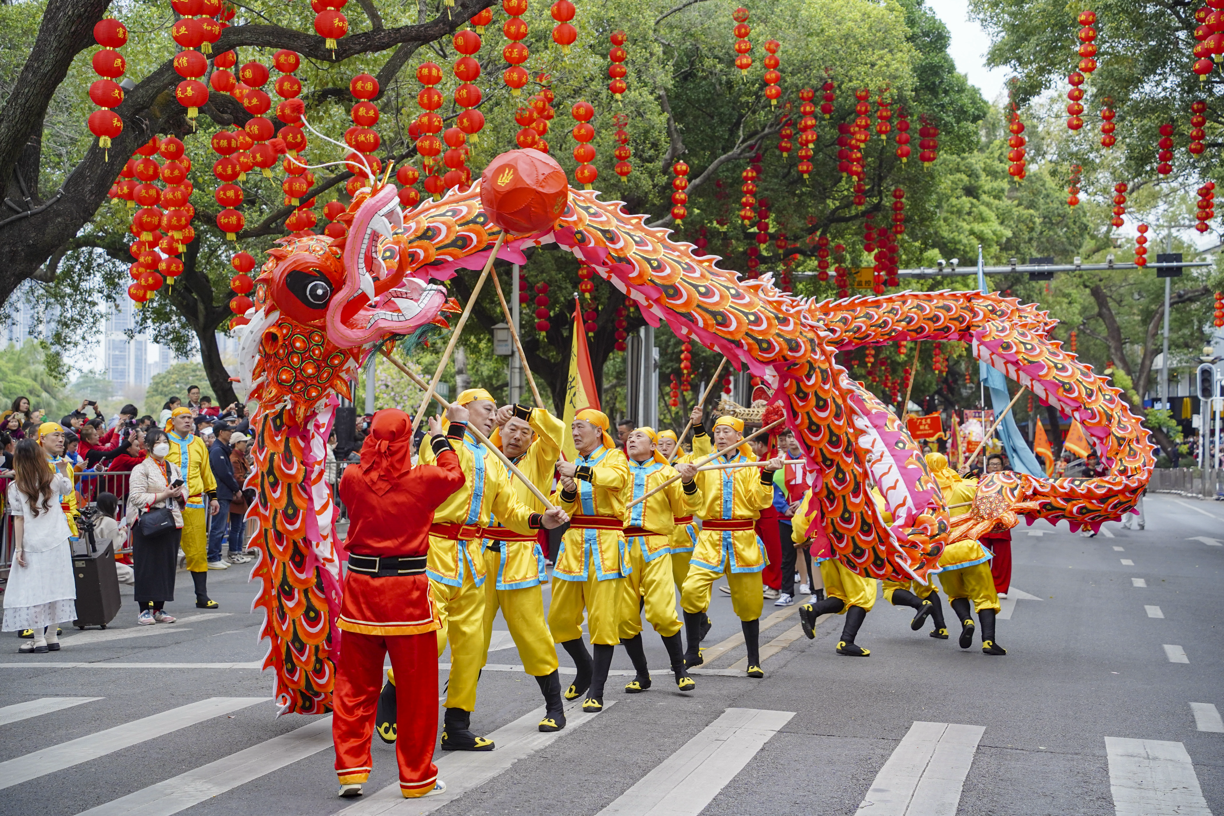 造型夸張的重慶銅梁龍舞、舞姿變化多端的浙江長興百葉龍、與幾十名擊鼓者同舞的湖北云夢三節(jié)龍、起源于宋代的安徽手龍舞、被譽為“東方活龍”的四川瀘州雨壇彩龍,以及來自惠州本土的惠東蓋子獅、鐵場鄒氏醒獅等,這方唱罷,那方登場。當晚,這場精彩的龍舞大巡游還登上了央視新聞聯(lián)播。