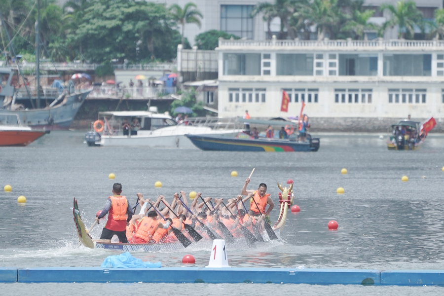 此次龍舟邀請賽分為男子組、女子組和公開組!芭椋 9時(shí)50分,隨著一聲清脆的發(fā)令槍響,一艘艘龍舟勢如箭發(fā),伴隨著節(jié)奏感十足的鼓點(diǎn),運(yùn)動(dòng)健兒奮楫爭先,一葉葉龍舟劈波斬浪,在海面飛濺起朵朵浪花。