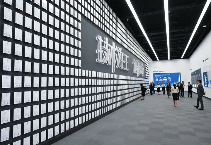 在位于深圳市坪山區(qū)的比亞迪全球總部展廳內,一面集中展示企業(yè)所獲專利的展示墻吸引來訪者的目光(2024年7月22日攝)。新華社記者 李賀 攝