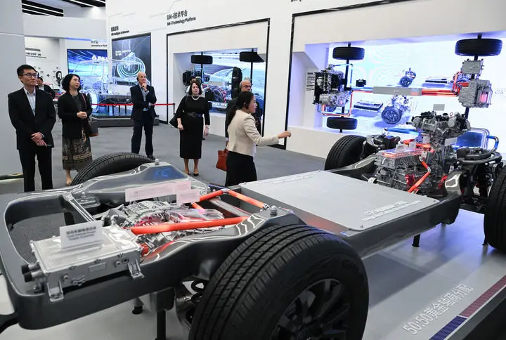 外賓在位于深圳市坪山區(qū)的比亞迪全球總部展廳參觀(2024年7月22日攝)。新華社記者 李賀 攝