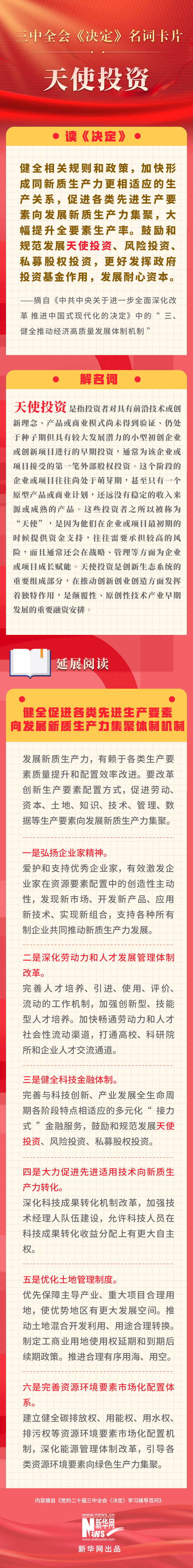 黨的二十屆三中全會審議通過了《中共中央關(guān)于進(jìn)一步全面深化改革、推進(jìn)中國式現(xiàn)代化的決定》。新華網(wǎng)依據(jù)《黨的二十屆三中全會〈決定〉學(xué)習(xí)輔導(dǎo)百問》,制作三中全會《決定》系列名詞卡片,和大家一起來深入學(xué)習(xí)領(lǐng)會二十屆三中全會精神。本期名詞是“天使投資”。