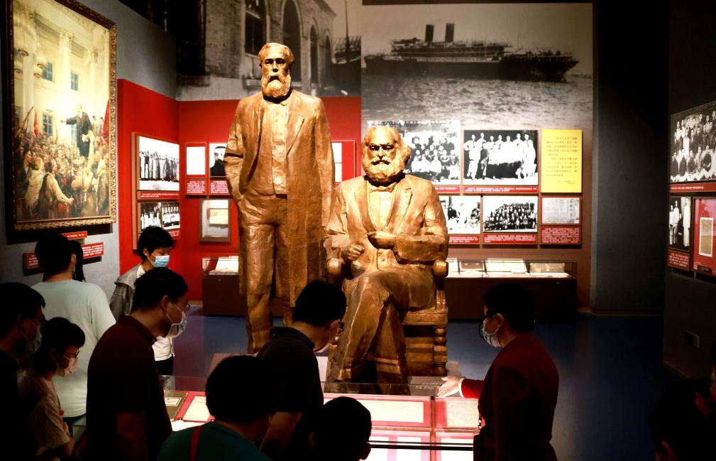 2022年7月3日,參觀者在中國共產(chǎn)黨歷史展覽館內(nèi)的馬克思與恩格斯雕像前了解展出內(nèi)容。新華社記者潘旭攝