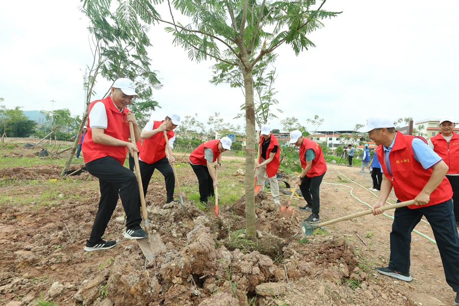 植樹活動現(xiàn)場,大家合力扶正樹苗、揮鋤填土、提桶澆水、掛上名牌……一派熱火朝天的忙碌景象。跟隨爸爸媽媽來的“小博士”們一個(gè)個(gè)也不甘示弱,鏟土、澆水,揮汗如雨,有模有樣。在大家的齊心努力下,不到1個(gè)小時(shí)工夫,60棵鳳凰木便都種好了。一棵棵綠苗迎風(fēng)挺立,充滿盎然生機(jī)。