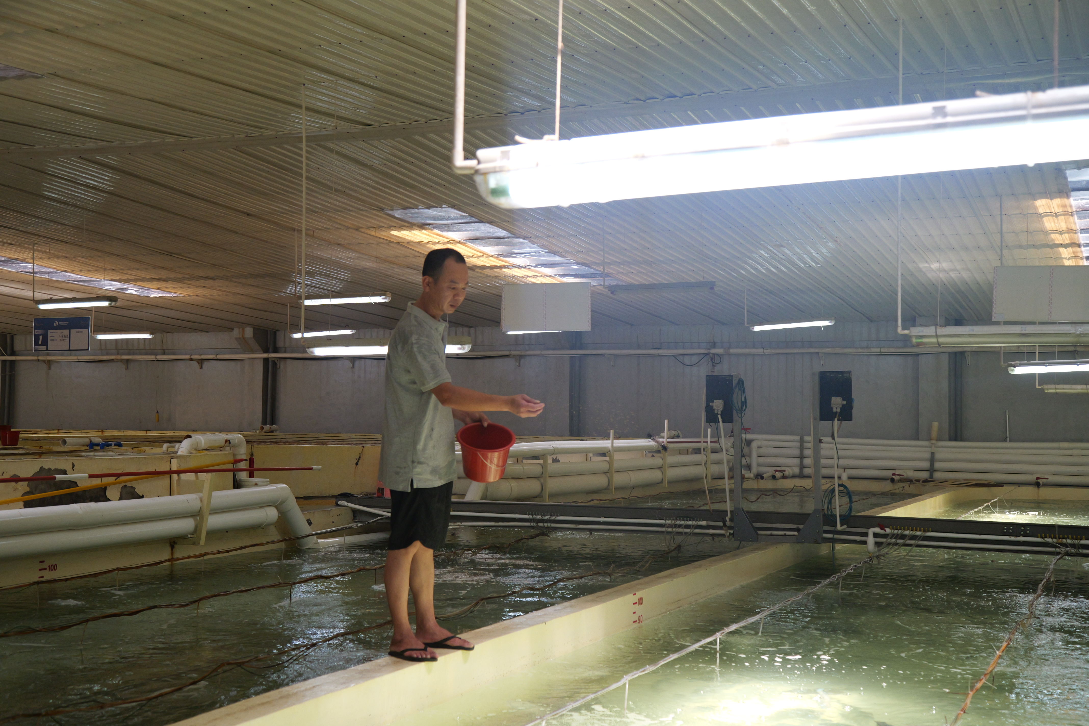 廣東省鰉鯨海洋生物科技有限公司養(yǎng)殖基地的工作人員正在喂魚。
